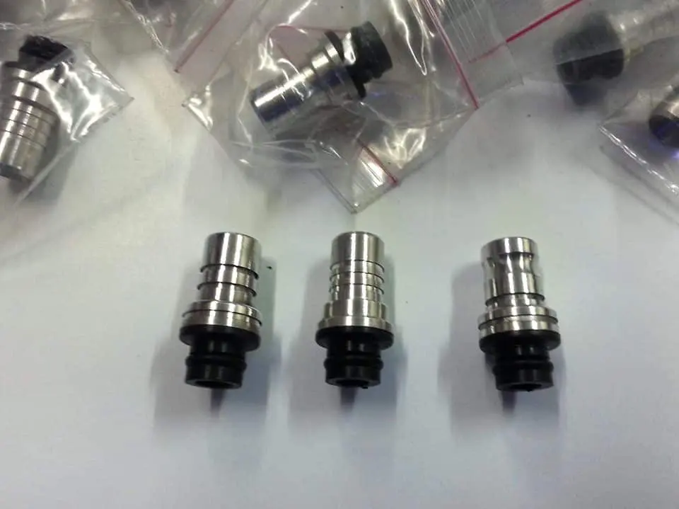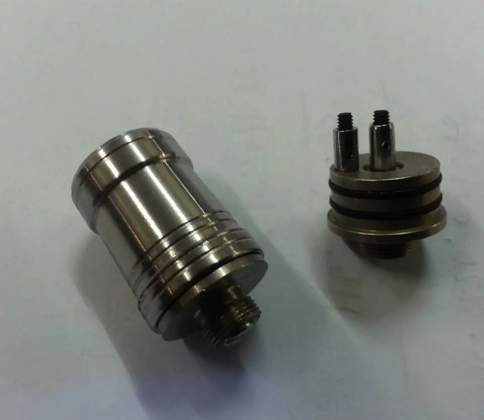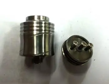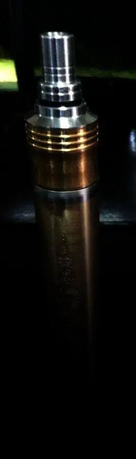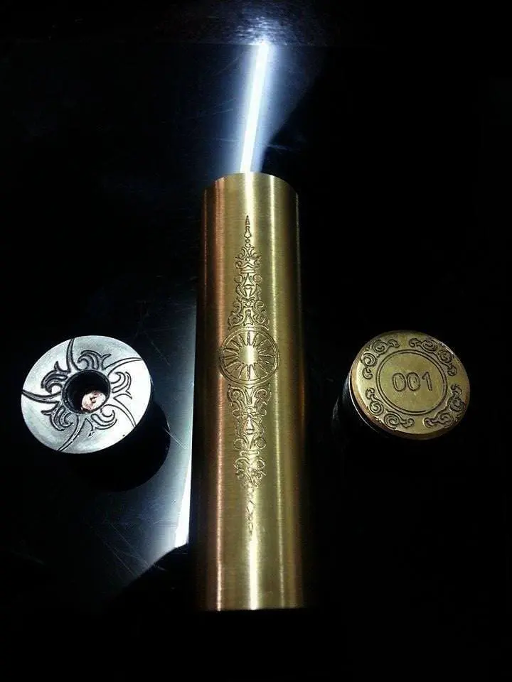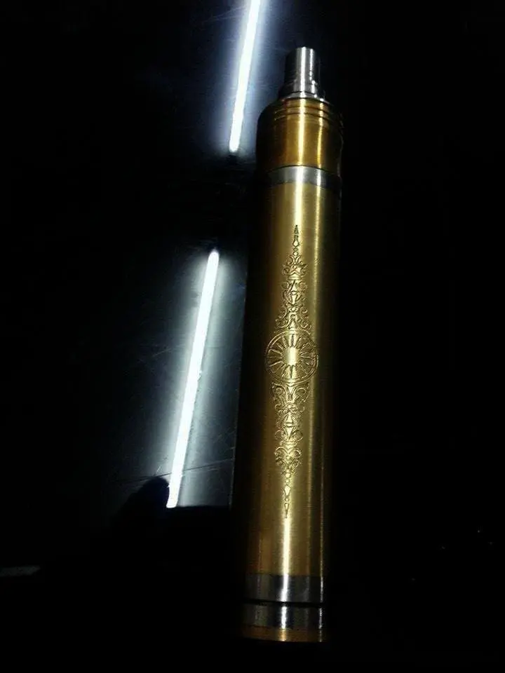 Pylon signage for vape shop in Makati—brass cylindrical mod, engravings, on black reflective surface. By M&G Global Ads.