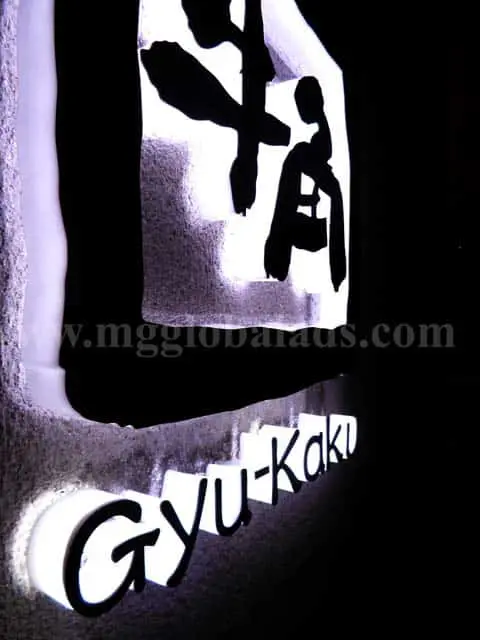 Illuminated LED signage for Gyu-Kaku with Japanese kanji, glowing white in Quezon City, by M&G Global Ads.