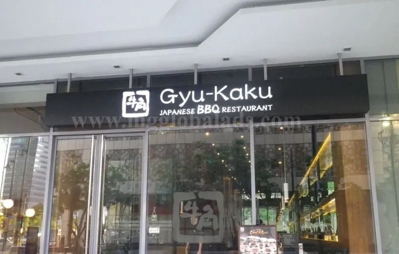 Building signage for Gyu-Kaku Japanese BBQ Restaurant in Makati with bold white letters on black, by M&G Global Ads.