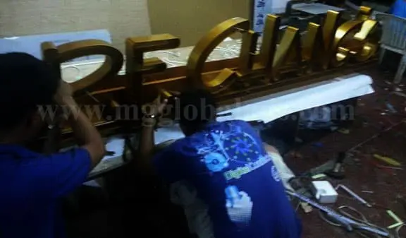 Gold metallic LED signage assembly for RE CHANG in Quezon City, with tools and wires visible, by M&G Global Ads.