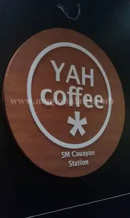 Circular wooden indoor signage for YAH Coffee at SM Cauayan Station, seen indoors in Makati, by M&G Global Ads.