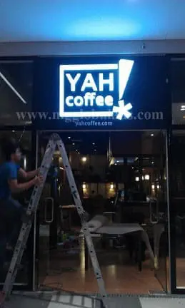 LED signage installation for YAH coffee café in Quezon City at night by M&G Global Ads.