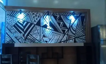Acrylic wall signage in a bold black and white geometric cafe interior, Cubao location. Lighting by M&G Global Ads.