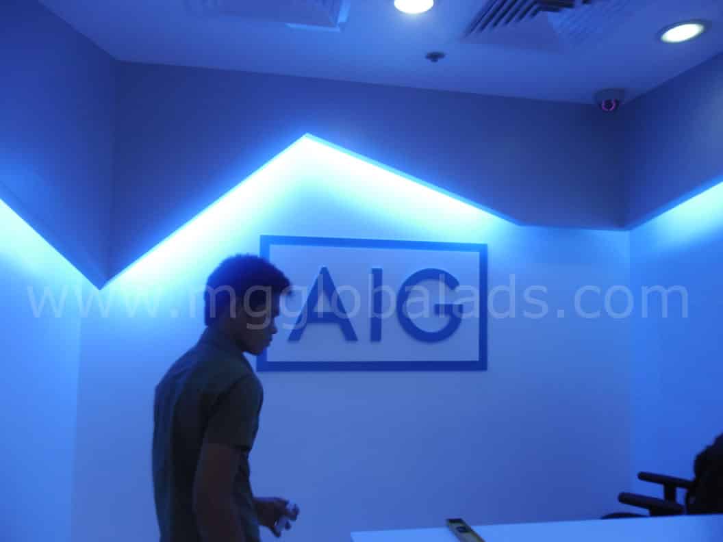 AIG LED signage with blue lighting in a modern Makati office, featuring chairs and white table, by M&G Global Ads.