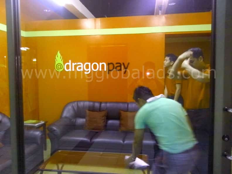 Dragonpay flame acrylic building signage in Makati office lounge, three men cleaning and chatting by M&G Global Ads.