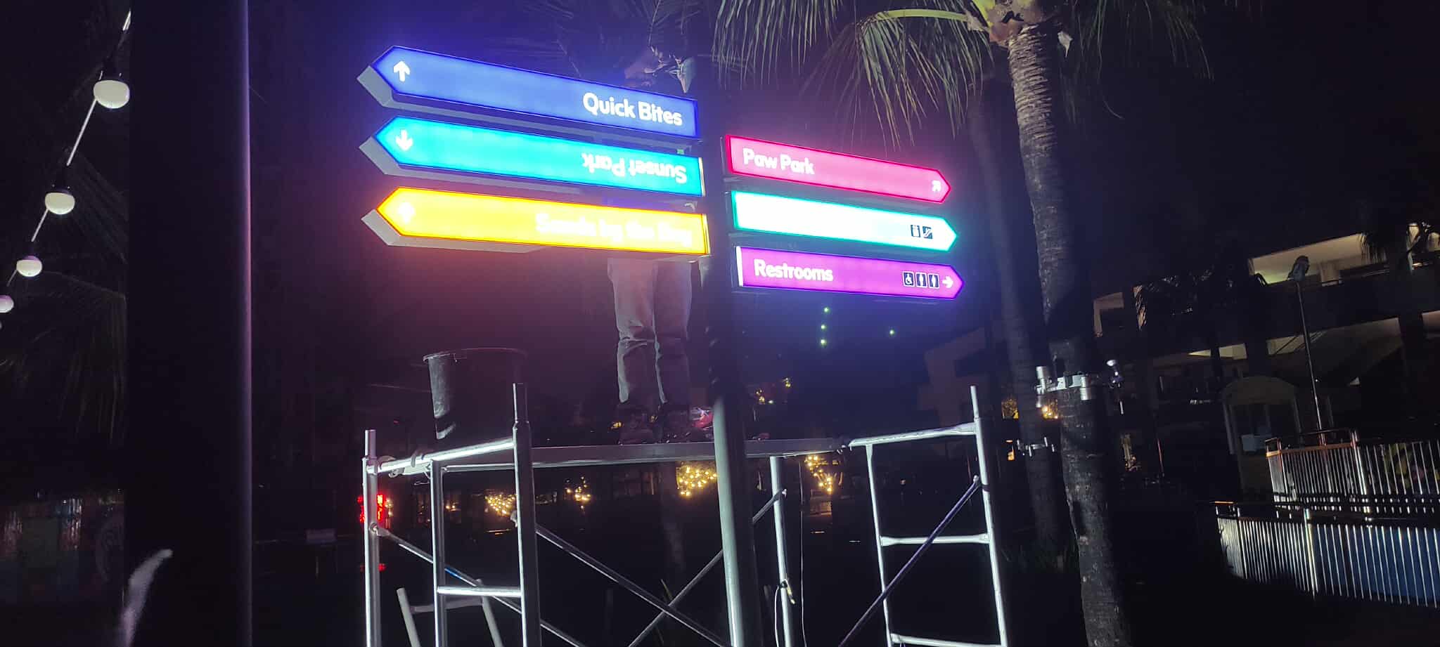 Safety protocols and precision rigging were critical in these projects, reinforcing our capability to handle complex structural environments across diverse locations as a premier building signage contractor.